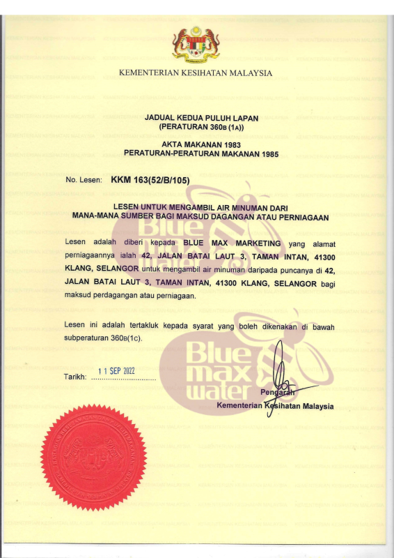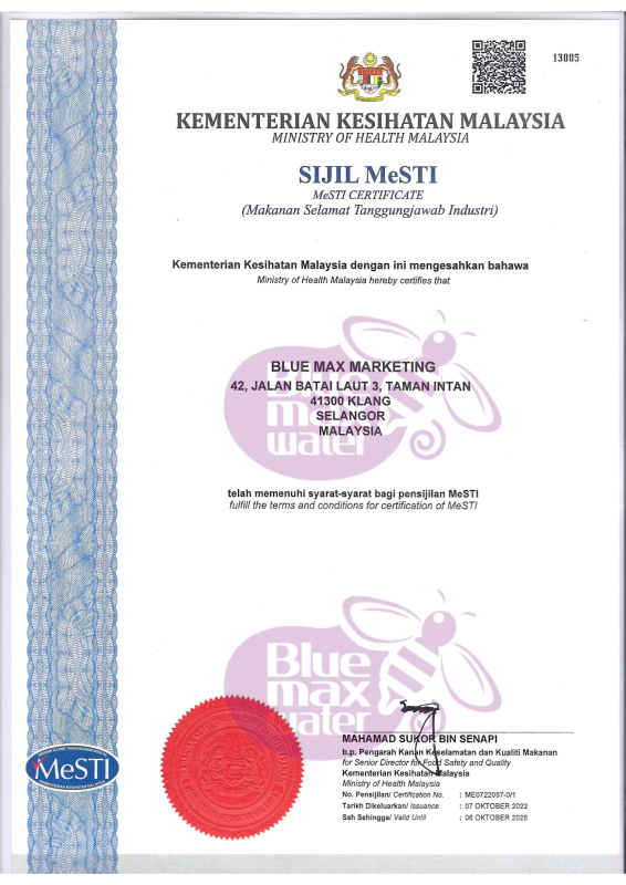 Blue Max Water is an official licensed Water Manufacturer with license [163(52/B/105)] by the Ministry of Health Malaysia (KKM), and certified by Makanan Selamat Tanggunjawab Industri Certification (MeSTI). As a water product manufacturer, we carry out frequent testing by both governing parties, and independent labs to ensure that our product is safe for consumption. We adhere to strict regulations required by governing bodies from manufacture to warehouse, and subsequently to delivery.